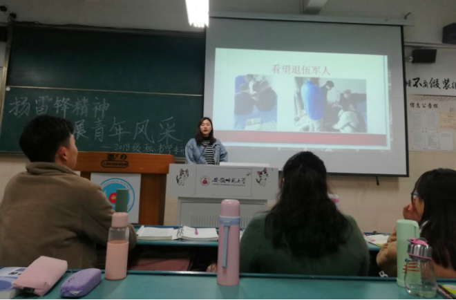 3月14日晚,由团支书郭丹丹主持的“扬雷锋精神,展青年风采”宣讲会在2050403教室举行。会议开始,郭丹丹介绍了活动相关流程,明确了雷锋精神在当今仍是主流价值观,呼吁全体同学要一起发扬雷锋精神,建设和谐校园。随后,三位同学分别上台宣讲,介绍了有关雷锋的生平事迹和身边的雷锋故事,并说出了他们对雷锋精神内涵的理解。最后,郭丹丹总结:“雷锋,虽不在你我身边,但雷锋精神却永驻心头,我们也会将雷锋精神贯彻到底,弘扬社会正气”。
