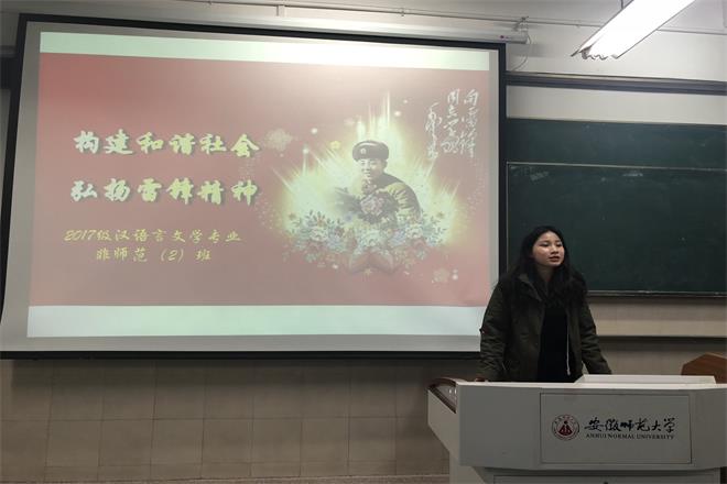 此次活动由班级团支书刘天朋同学主持,分别从三个板块向我们介绍了“雷锋是谁?”“什么是雷锋精神?”“雷锋给予我们的精神遗产有哪些?”等问题。