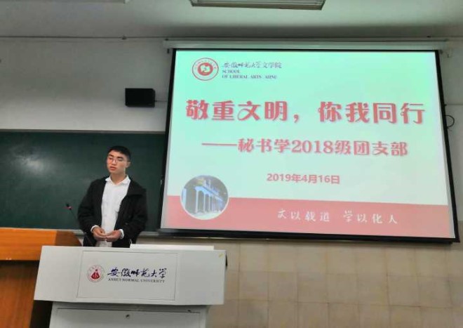 “从当下回顾历史,从历史延伸未来。”4月16日晚上19:30,秘书学2018级团支部在行知楼2050501教室开展了“敬重文明,你我同行”的主题团课活动,2018级秘书学班全体同学参加。