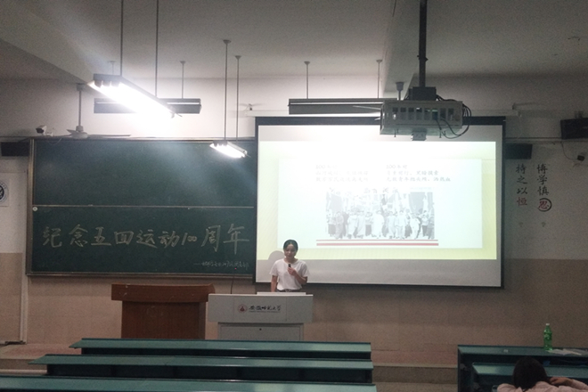 李婉笛在活动开始前介绍了五四运动的重要意义,并且希望同学们在这次活动中学习五四精神,朝着自己的目标不断努力与奋斗。之后来自2017级汉语言文学非师范专业的同学作了以五四历史为主题的宣讲,在宣讲中详细介绍了五四运动的历史起源与重要影响。同学们在宣讲过程中细心聆听,现场不时的响起热烈的掌声。在宣讲完毕之后,李婉笛播放了两段与五四运动有关的视频,一段是顾维钧在巴黎和会上的演讲,向大家展示了外交官为了中国的国家利益所作出的努力与坚持。另一段是建党伟业的部分情节,让大家知晓了五四运动时期社会各界人士为了国家的领土与主权作出的不懈奋斗,尤其是青年学生更是在其中扮演了重要的角色。播放结束后,李婉笛再次为大家讲解了五四精神的内涵,并号召大家做新时代的青年,为社会作出应有的贡献。