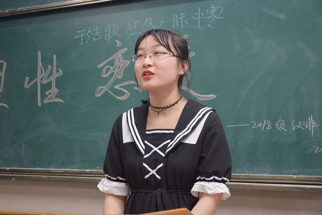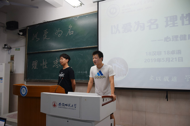 为营造良好心理健康氛围,增进两班友谊,521日晚7点,2018级汉语言文学(非师范)专业联合2018级卓越语文教师实验班于2050103教室举办以“以爱为名,理性恋爱”为主题的心理健康周特别活动,18汉非班长黄星宇、心理健康委员蔡晨曦、18卓语媒体管理员王府主持,汉非班和卓语班全体同学参加。