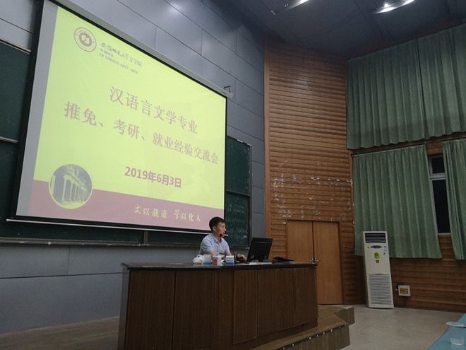 为引导2016级汉语言文学(师范)、汉语言文学(非师范)专业的学生做好推免、考研、就业准备,辅导员周青松老师特邀请2015级优秀学生代表于6月3日晚在行知楼一栋2010105教室开展推免、考研、就业经验交流会。