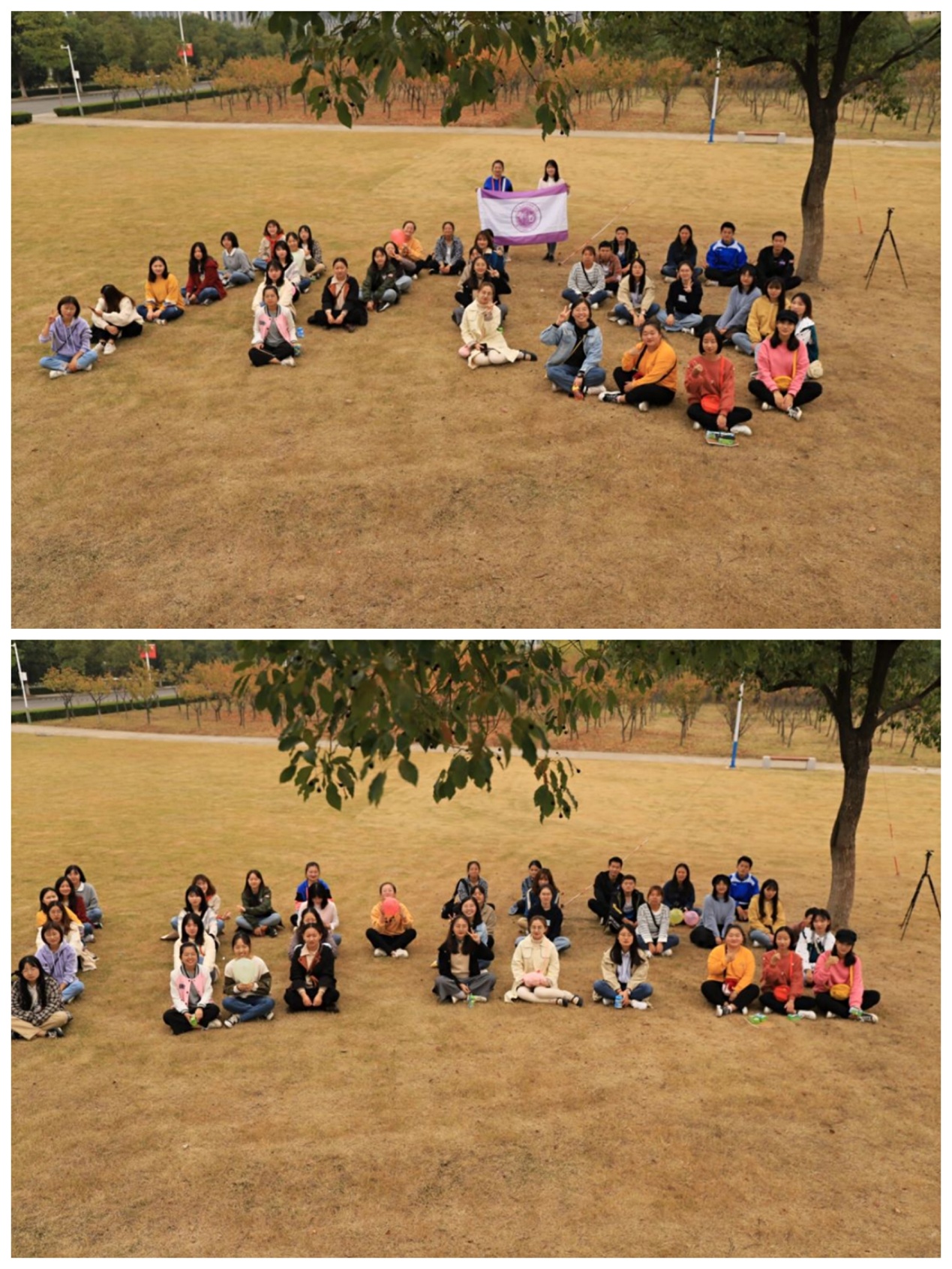 此次心理健康团建活动共分为三个篇章。在第一篇章《生如夏花》中,“心相连,共团结——生死与共”和“心有气,共释放——守住最后的气息”两个环节相继展开,无论是合作站立在一张报纸上,还是互相踩爆气球得到释放,都使同学们的心灵在游戏中得到充分的放松。在第二篇章《以爱之名》中,通过“心有结,共解决——解心结,抓住爱”和“心有爱,共传播——你爱我有几分”两个环节,从班集体的角度,使同学们在集体的力量中得到心理上的解压。在第三篇章《合影留念》中,班级同学共同摆成“10·25”和代表秘书学班“M S”的字样,为此次心理健康团建活动划上了圆满的句号。