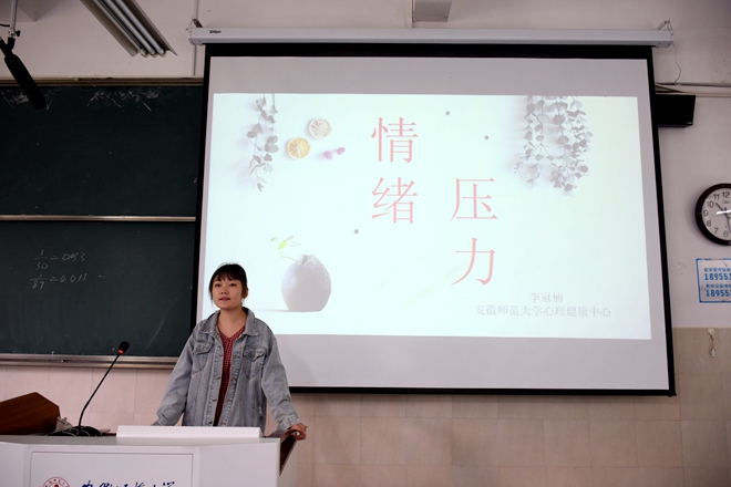 10月27日上午,由18汉非、18卓语两个专业联手开展的“语你相约”系列讲座第一期“情绪管理与压力应对”在行知楼2050103如期举行。安徽师大教科院心理健康教育研究生、《大学生心理健康教育》参与编制者李冠楠应邀主讲。本次讲座由18汉非心理健康委员杨溢冲主持。