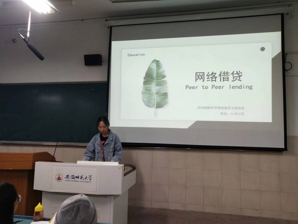 11月13日晚7点,2018级秘书学专业在行知楼2050501教室召开“网络借贷”主题安全班会。班会由安全委员周宇同学策划并主持,全体同学参加。