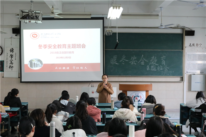 为进一步增强同学们的安全意识,规范冬季用电安全,促进同学们养成良好的生活习惯。12月5日下午,2018级汉语国际教育专业于2050202教室召开冬季安全教育主题班会,本次班会由辅导员朱露露主持,2018级汉语国际教育专业全体学生到场参加。