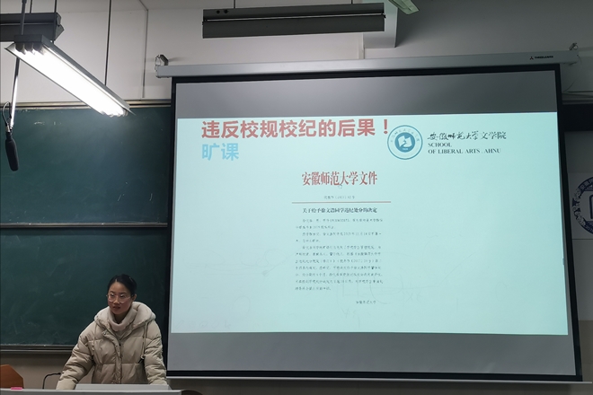 会议伊始,孙霁雯老师首先就诚信考试问题对同学们提出要求,重申了考试作弊行为的严重后果。接着,孙霁雯老师分析了四班期中考试总体情况,为同学们期末备考提出建议,勉励同学们认真复习,并针对考试周期间同学们的晚自习安排做出布置。此外,孙老师还提及了包括用电安全、晚归不归、垃圾分类等问题在内的一些寝室注意事项。随后,班长贺雯针对诚信考试问题做出了更加细致化的要求,结合校园里已发生的违纪违规案例,向同学们展示违纪违规行为产生的后果,让同学们更加明确违规、违纪行为对个人、对班级的严重危害,以此警醒班级众人。