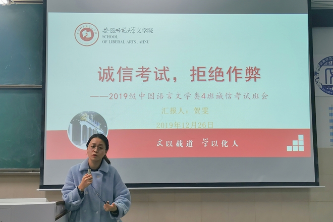 为进一步增强同学们的诚信意识、端正考风考纪,帮助同学们更好地迎接即将到来的期末考试,12月26日晚,2019级中国语言文学类四班在行知楼2050203教室举行诚信考试主题班会暨导生经验交流分享会。辅导员孙霁雯老师,班级导生杜岳龙、武美迪、蔡英杰以及2019级中国语言文学类四班全体同学出席会议。班会由班长贺雯主持。