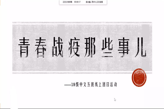 3月22日晚,19级中国语言文学类五班采用QQ语音通话的方式举办了2020年第一次线上团日活动。本次活动主题为“青春战疫那些事儿”,由班级团支书卞玉雯同学主持,19级中国语言文学类五班全体同学参加。
