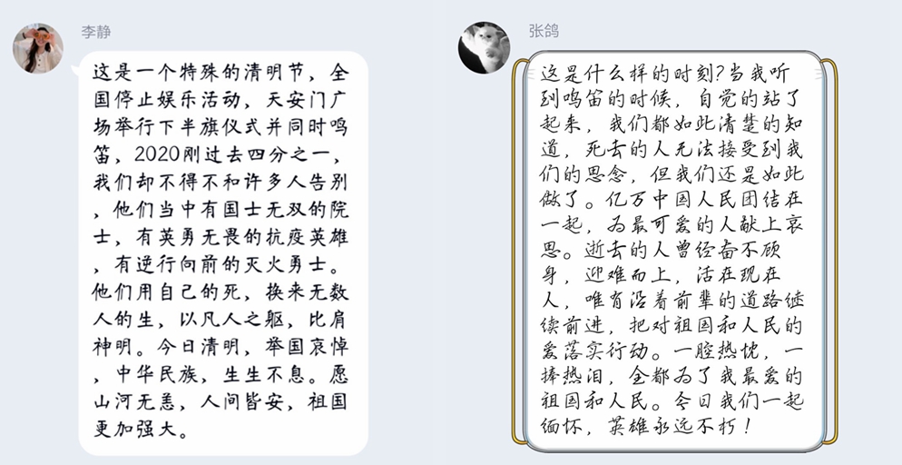 班会伊始,赖昕涓同学为大家讲述了一些可歌可泣的“抗疫”英烈们的事迹。英烈们勇担使命、不怕牺牲的精神深深触动了同学们。大家怀着严肃与沉痛的心情,以留言方式表达了对烈士与牺牲同胞们的深切悼念。