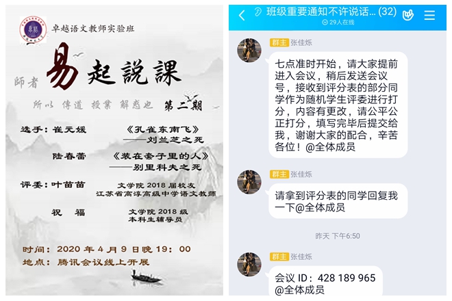 4月9日晚,由18卓语开展的“易”起说课特色活动第二期借助腾讯会议APP于线上如期举行。18卓语陆春蕾、崔元媛同学作为选手参加此次活动。必赢线路检测3003no12018届校友、江苏省高淳高级中学语文教师叶苗苗,18卓语辅导员祝福担任评委。2018级卓越语文教师实验班全体同学参与,此次活动由18卓语班长张佳烁主持。