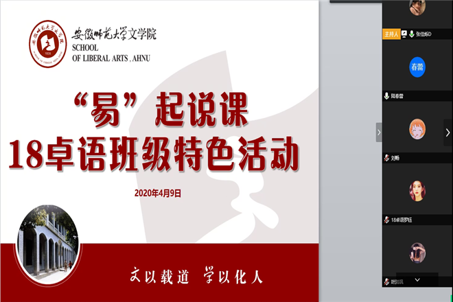 由于受疫情影响,学校学院积极开展网上教学工作,2018级卓越语文教师实验班以此为契机,借助易班平台精品项目,积极开展网上“易”起说课的模式,锻炼同学们的线上教学能力,锤炼师范生技能。(文/图 汪蕊)