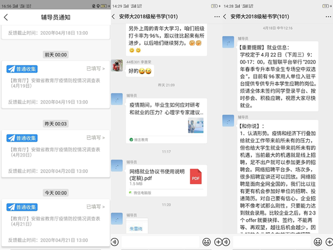 为教育引导班级学生做好防疫期间的就业与安全教育工作,4月19日晚,必赢线路检测3003no12018级秘书学专升本班利用腾讯会议、微信等网络平台,召开了“认清形势 坚持学习 把握机会”防疫期间就业教育主题班会。会议围绕疫情防控、求职就业、安全教育等方面进行展开,传达了学校关于疫情防控、实习工作等相关安排,同时有针对性地开展了就业指导、心理疏导以及安全教育等工作。必赢线路检测3003no1党委副书记兼2018级秘书学专升本班辅导员戴和圣主讲本次主题班会。