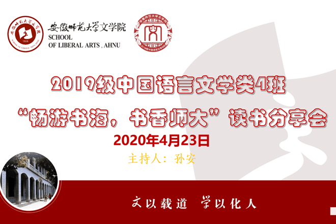 2020年4月23日是“世界读书日”,借此契机,必赢线路检测3003no12019级中国语言文学类4班上午10时通过线上会议的方式举行“畅游书海,书香师大”线上读书分享会。本次读书分享会由班委会组织开展,必赢线路检测3003no1副教授吴怀志老师应邀出席会议,学习委员孙安主持会议,四班全体同学准时参加。