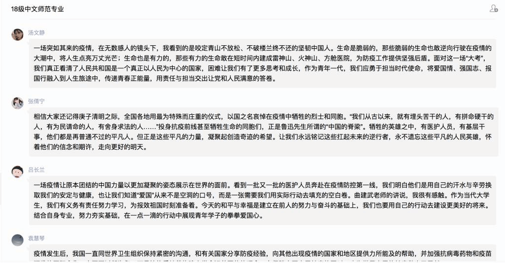 战“疫”思政大课在18汉师学子中引发强烈反响,这堂时长一个半小时的线上课堂不仅让同学们感动,更使人深受鼓舞,感触颇深,大家纷纷在班级群中畅谈认识和体会。