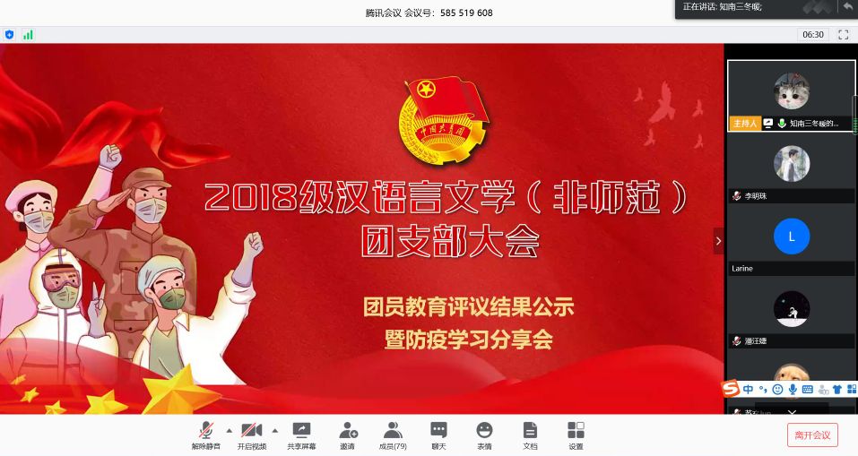 本次会议采用线上交流方式,首先进行的是抗击疫情线上学习活动。团支书夏晓晓带领同学们学习习近平总书记2月23日《在统筹推进新冠肺炎疫情防控和经济社会发展工作部署会议上的讲话》,并从不同阶段的疫情防控工作、经济社会发展两大主要方面对习近平总书记重要讲话精神进行解读。视频观看结束后,团员青年代表佘静雅、武美迪、杨溢冲结合学习内容以及自身参与疫情防控的情况就学习生活、个人发展和心态调节等方面与同学们展开分享交流。
