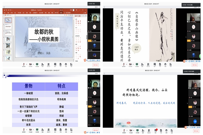 吴菂同学由“文中集中描写故都秋景是在哪些段落”这一问题引入课堂,着重讲述了文章中的“小院秋晨图”,并且得出“北国的秋”的特点——“清、静、悲凉”。“心似已灰之木,身如不系之舟。问汝平生功业,黄州惠州儋州”,汪涵琳首先向大家提问“《自题金山画像》这首诗中描写的主人公是谁”,由此引入苏轼。紧接着她带领同学们走进了苏轼被贬黄州期间所作的《定风波》。她对这首词的序、上阙进行分析,指出其“无惧风雨”、“无惧冷暖”的特点。