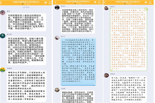 上午九时,同学们通过安徽共青团政务新媒体平台在线收看了由省委宣传部、省委教育工委、团省委、省学联共同出品的《“绽放战疫青春·坚定制度自信”青春思政课》。课程主题为“战‘疫’里的安徽青年”,课程分为“逆行”“速度”“承诺”和“我们”四个部分。坚守在抗击疫情一线的四组安徽青年群体代表通过讲述他们的青春战“疫”故事,展现了青春风采,绽放了青春力量。观看结束后,同学们积极分享了自己的观后感与学习心得,其中陈芯茹、程妍等同学通过个人书法、制作摄影与创意书签等作品,展现了五班的青春战疫风采。