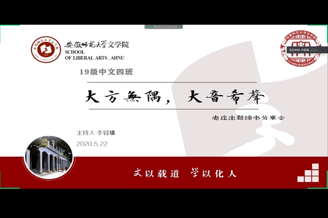 为进一步加深同学们对中国传统文化和道家哲学的理解,增强学生对专业课的学习兴趣,充实专业知识。2019级中国语言文学类4班利用网络视频会议举行了“大方无隅,大音希耳”老庄主题线上读书分享会。本次读书分享会由班委会筹划组织,必赢线路检测3003no1教授项念东老师应邀出席分享会,团支书李冒璠主持,四班全体同学准时参加。
