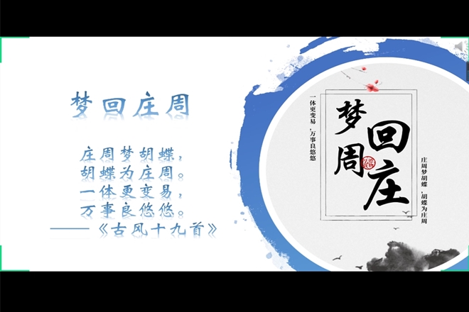 会议伊始,李冒璠代表全体同学对项念东老师的到来表示热烈的欢迎。陈慧慧同学首先向大家介绍了自己对《逍遥游》的理解。陈慧慧认为:庄子《逍遥游》的原义思想的最根本所在是对人如何正确生活进行探讨。她从鲲鹏展翅、蜩鸠之辩、逍遥之境三个方面阐释三个层次的思想:即正确认知人的状态、正确认知人的价值、正确对待人的生命,从而了解如何破除认知局限,获得更正确、更理想、更美好的人生。第二位分享者陶琬璐用生动活泼的语言向大家分享了自己心中的老庄形象,通过展示老庄的事例,将老子的性格颇具趣味地概括为“敢说敢想”,将庄子则概括为“穷、傲、博”。在分享临近结束时,陶琬璐以近日傍晚散步时拍摄的唯美照片来传达自己向往的平静心境。随后第三位分享者吴慧敏则以“庄周梦蝴蝶”开篇,向同学们介绍庄子及其“道”的释义:“道”“有情有信”,是宇宙的本体,是产生万物的根源。第四位分享者杨颜祯在陈慧慧分享的《逍遥游》基础上,简单介绍《庄子·内篇》篇目的主要内容,向大家展示了庄子是一位多样化的人才,有着整体全局观和瑰丽的思想。最后一位分享者孙安,不仅概述了老子的主要思想,而且以独特的视角,分析老子的“愚民”政策并非真的“愚民”,只不过是老子复古思想的延续等。