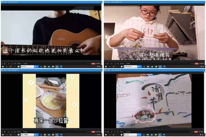从一个幽默的小视频开始了今天的班会,卢婧怡带着大家分享了同学们在生活中学到的各种技能。美食方面,有雍佳怡同学带来的小甜点菠萝披萨,还有虞佳琪同学带来的菠萝香肠炒饭;音乐方面,有茆雯婷同学新学的吉他弹奏和傅臻杰带来的钢琴演奏,以及团支书谢诗琪的唱跳歌舞;办公技能方面,王如玥同学带来了一些ps小技巧,朱梦雅同学则带来了干货p图技巧,王梦影同学教了同学们如何制作可爱有趣的手书。最后,还有杨楠楠同学分享的摄影小视频,鲁洪同学分享的美丽水粉画等等。线上的互动交流,不仅促进了同学们之间的情感友谊,还能很好地调解一个人在家可能出现的烦闷、焦虑的情绪,给平时的学习生活带来放松愉悦。