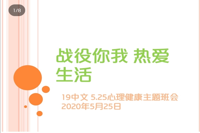 为迎接“525大学生心理健康日”的到来,关心疫情期间大学生心理健康,帮助同学们学会减轻心理负担,5月25日上午9时,2019级中国语言类4班在线上举行了主题为“战疫你我,热爱生活”的心理健康主题班会。本次活动由心理委员胡秋雨主持,4班全体同学参与。