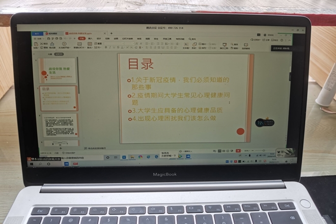 会议伊始,胡秋雨便首先介绍了关于新冠疫情的实时情况,新冠疫情并不可怕,全国上下众志成城,团结一心,总会迎来“春暖花开”的那一天。然后胡秋雨又向大家介绍了疫情期间大学生常见的心理健康问题:在认知上,可能因为接收到众多且复杂的信息,进而导致大学生无法做出正确的判断;在情绪上,会出现无聊、烦躁、消沉等困扰;在行为上,由于脱离校园环境,很容易产生惰性的思想;在人际交往上,可能会出现交际范围变小的状况。最后,胡秋雨通过视频短片的形式,向大家展示了战疫中的青年力量。并且向大家介绍了当出现心里困扰时我们应该采取的各种措施,如寻找他人倾诉、寻求专业心理辅导等等。线上的交流活动,不仅更加全面的宣传了心理健康的知识,还能促使同学们乐观地面对生活,给平时的学习生活带来放松愉悦。