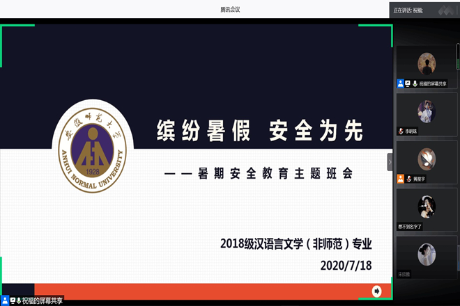 为提高学生暑期安全意识,落实学校疫情防控决策部署,7月18日晚,2018级汉语言文学(非师范)专业通过腾讯会议线上召开了“缤纷暑假 安全为先”暑期安全教育主题班会。会议由辅导员祝福老师主持。