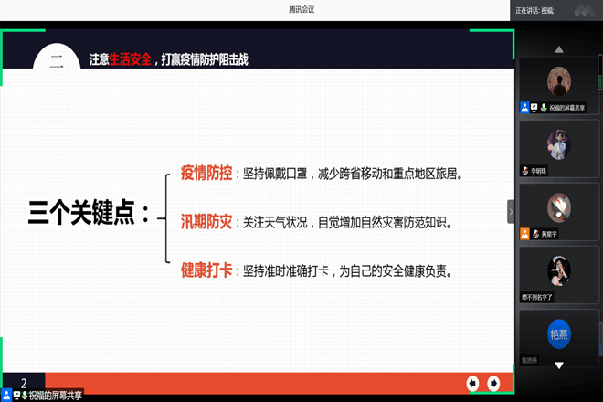 会议伊始,祝福老师就同学们的假期安排提出合理的建议,介绍了大学生艺术展演等相关赛事,鼓励同学们可以通过参加暑期赛事、阅读书籍、暑期兼职等方式充实自己的生活,度过缤纷多彩的假期。随后,他就疫情防控、汛期防灾和健康打卡三个关键点提出要求,提醒同学们面对最近的汛情和疫情要提高安全意识,减少聚集、跨省出游、靠近水边等。祝福老师对同学们的心理状况也表示关切。特殊时期,他提醒同学们关注自身心理健康,积极与家长老师沟通,寻找适当的解压方式。