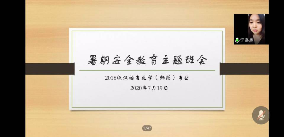 7月19日晚,2018级汉语言文学(师范)专业通过云端召开2020年暑期安全教育主题班会暨暑期社会实践动员会,18汉师学子全员参加,会议由辅导员宁嘉惠老师主持。