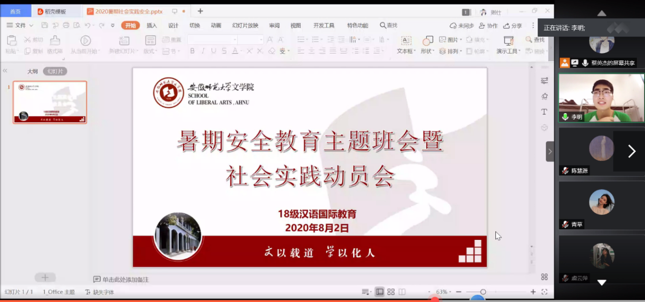 82日晚,2018级汉语国际教育专业于腾讯会议召开线上暑期安全教育主题班会暨社会实践动员会,旨在提高同学们的暑期安全意识,广泛动员班级同学积极参加暑期社会实践。辅导员朱露露、院学生会主席李明受邀出席,倾心分享。18汉教全体同学参加。