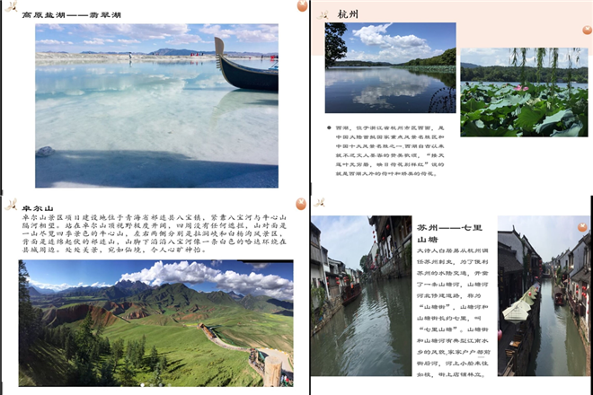 汪涵琳在实践中准备的课程题目叫“中国旅游——从东南到西北”。她表示:“我当时想,中国各地都有不一样的风景,如果都介绍一下,三天三夜也说不完。由于中国独特的地理位置,东南部和西北部的自然景色差异是最大的。东南河湖交错、树木葱茏;西北草原辽阔,大漠苍茫。从东南到西北,仿佛换了一个人间。”