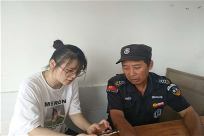 在路上,调研人员遇到一位保安爷爷,他口音纯正,笑容爽朗,听到调研人员的来意,乐呵呵地答应了调研人员的采访要求。据保安爷爷介绍,他叫朱国富,今年63岁,初中学历,在余井镇住了几十年,对余井方言了如指掌。