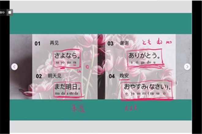 语言文字的魅力无穷,团队希望今天的日语基础课程可以让孩子们体验外语之美。负责此课程的黄祉璇队员将课程分为词语猜意、五十音基础、常用词学习、语法基础和造句练习五个部分,队员们和孩子们一起听、读,一起在语言知识里徜徉。