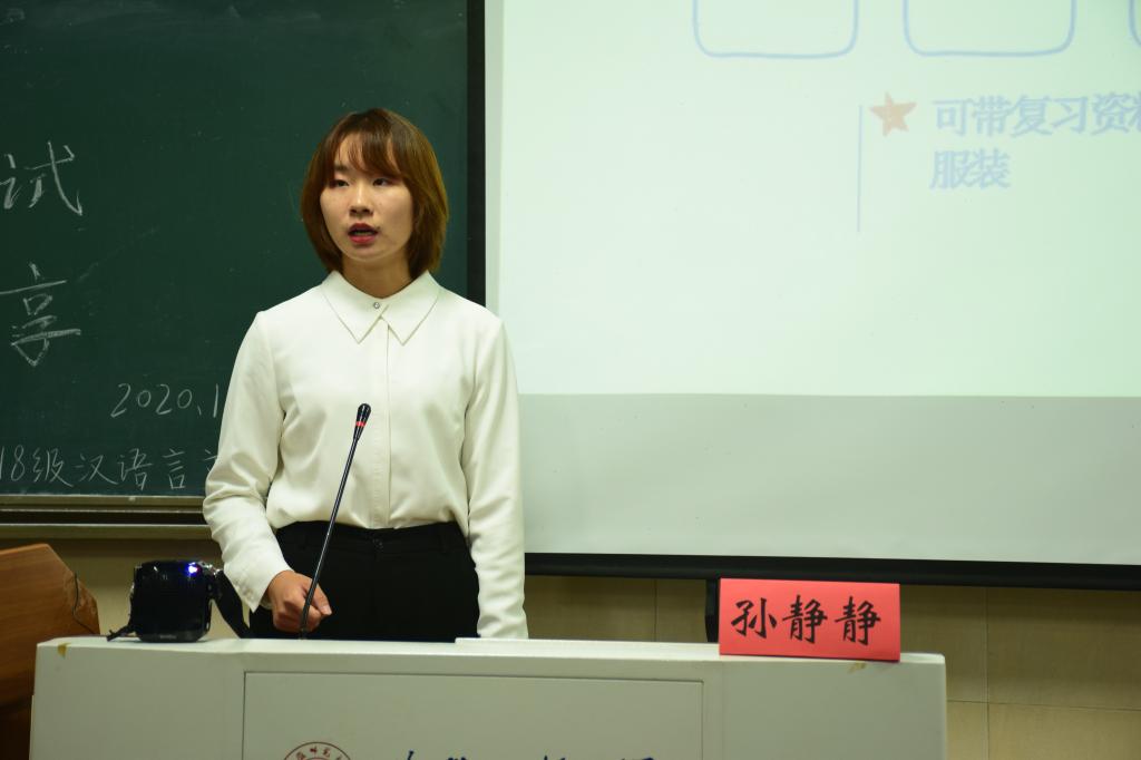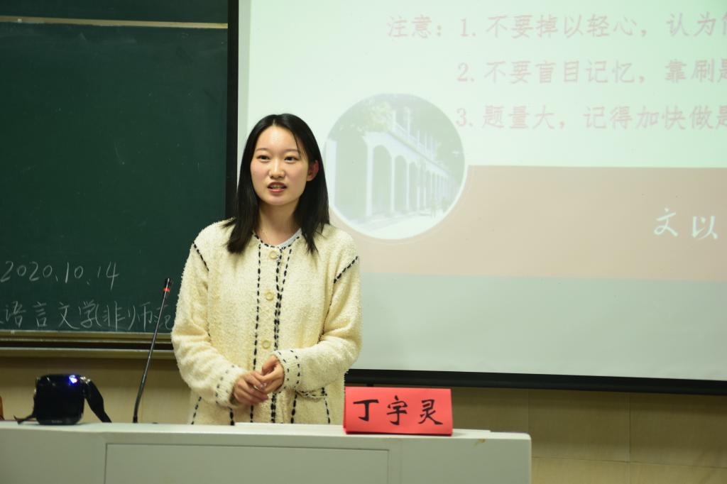 首先,丁宇灵为在场的同学们带来了教师资格考试中笔试方面的经验分享。她根据自己的备考经历,逐一介绍了《综合素质》《教育知识与能力》《语文学科知识与能力》三个科目的题型以及相应的作答方法。丁宇灵提到,对于选择题平时要多刷题,积累知识;在进行材料分析时,要结合具体材料和专业知识,严谨作答;教学设计要合情合理、层次分明。最后,她提醒同学们,做题时要注意把控好时间,希望同学们都可以取得好成绩。