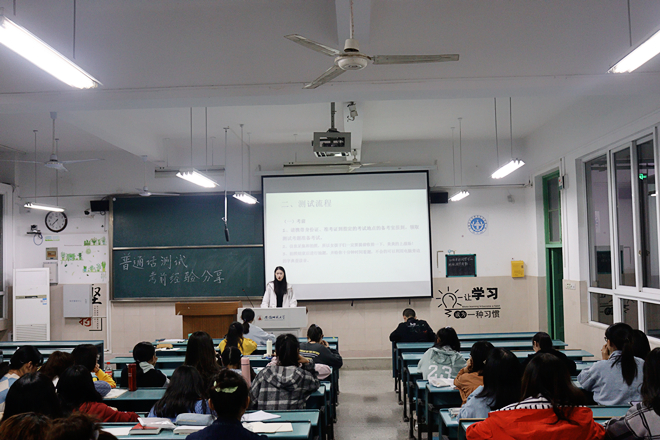 会议伊始,马庆宁用简短的语言向大家介绍了普通话水平测试的考试方式、等级标准和不同等级的具体要求。随后,马庆宁就测试流程、考试题型及分数分布进行了详细清晰的介绍与解读,列举了普通话测试的例题,使大家更具体直观地了解考试的内容。她还根据搜集到的相关材料资讯重点提醒大家关于普通话水平测试的失分点和注意事项。带领同学们了解完普通话水平测试的具体内容后,马庆宁针对考前练习进行了辅导资料的推荐和线上模拟练习软件的分享。最后,马庆宁同大家一起学习学长学姐关于普通话水平测试的考试经验,通过学习学长们的经验,同学们在积累考前知识的同时,也增强了考试信心。