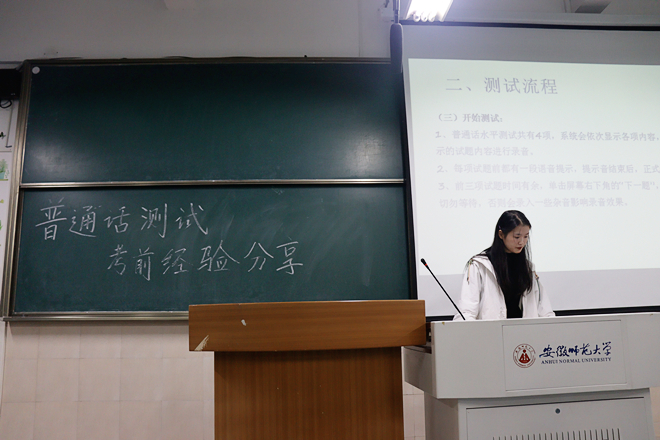 标准的普通话是师范生的必备技能,为增进学生对普通话测试的了解,进一步提高学生对普通话测试的重视程度20201026日下午,2019级汉语言文学2班2050201教室组织召开“普通话水平测试考前动员暨经验分享”主题班会。班会由学习委员马庆宁主持,19级汉语言文学2班全体同学参与。