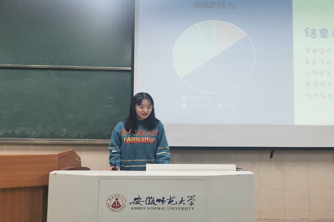 会议伊始,张蕤通过PPT演示、视频放映的方式,从近期的热点事件、同学们的生活状况、以及如何积极主动面对生活中的不如意等方面积极动员学生,并根据学生填写的心理健康调查问卷结果,根据数据统计进行分析:对于有多少同学面临着压力,这些压力都来源于那些方面,从压力产生的根源出发,提出相应的措施去有效缓解压力。张蕤还建议同学们制定时间表,及时、高效地处理任务,并留有休息时间,注重劳逸结合;要坚持户外锻炼和人际交往,打开心扉,乐于倾诉,积极向上地面对生活;同时,也可以把听音乐作为放松心情的一种方法。针对部分同学面临的经济压力,张蕤提出要以勤俭节约为前提,不盲目消费,坚持适度、理性、绿色的消费原则。在提出调节情绪的方法时,张蕤强调,家庭关系作为大学生生活的重要部分,是我们前进时的加速器和失败时的避风港——用零碎时间和父母打电话,建立家庭微信群,及时分享快乐和忧愁,也是缓解压力、维护家庭关系的重要途径。