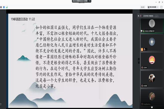 为深入贯彻落实习近平总书记关于“厉行节约,反对浪费”的重要讲话精神,弘扬中华民族勤俭节约的优良传统,进一步树立节约光荣、浪费可耻的文明意识。11月22日晚,2019级卓越语文教师实验班开展了“厉行节俭,反对浪费”线上主题团日活动。本次活动由团支书万振锐主持,19卓语全体同学参加。