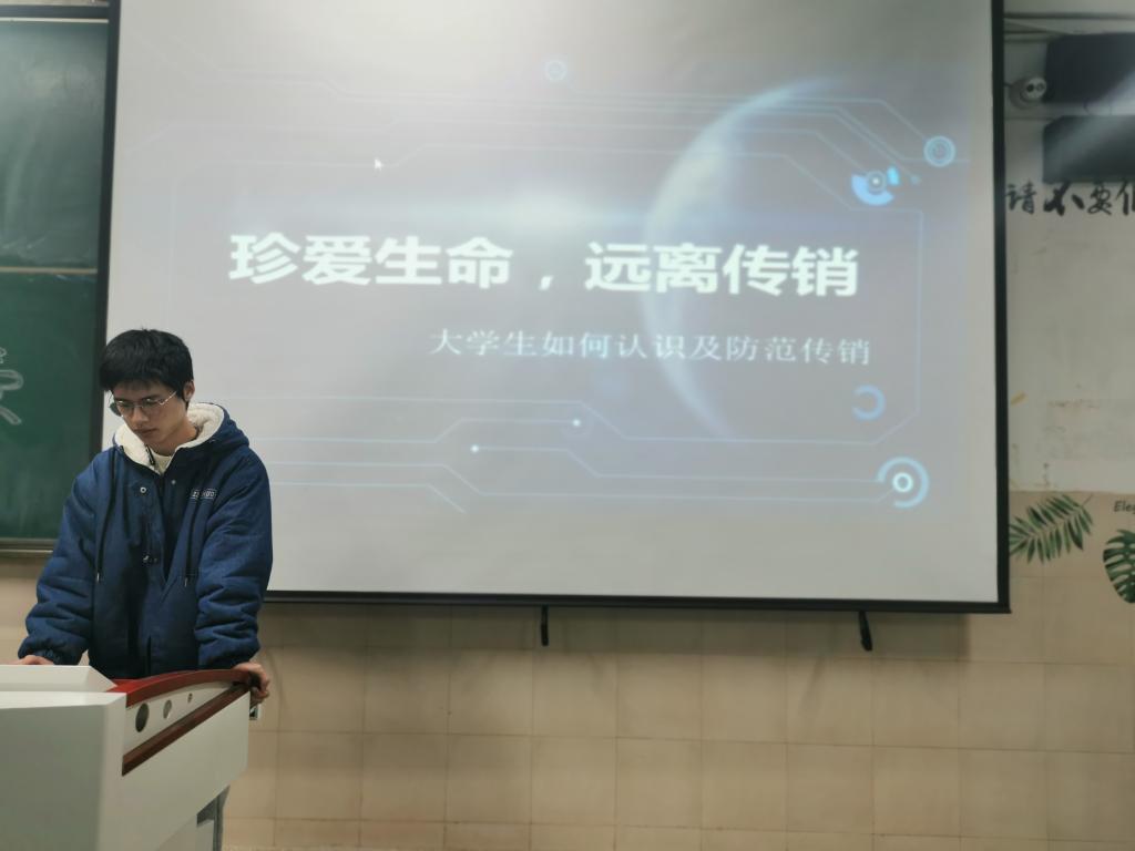 活动主持人,班长李俊从“什么是传销,传销的由来,传销的几种基本类别,如何预防鉴识传销以及求职时的传销陷阱“等五个方面为与会同学们普及传销知识,传销的滋生模式,传销的发展历史,传销的辨别方法及求职时的诸类注意事项等系列模块化防传销知识,为大家全面介绍了传销活动从源头到末端及其恶劣社会影响的一整个犯罪利益链条,使全体同学对传销活动及其危害有了更加清醒深刻的认识。