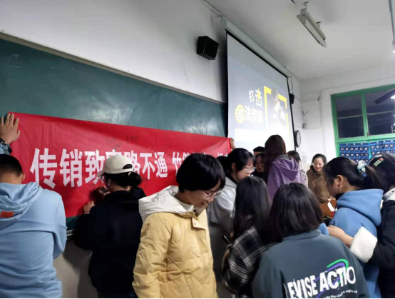 电影放映结束后,何鹏飞组织开展了有奖问答活动,以作答的方式加强了同学们对销的认识。举手的同学多达二十多位,其中李晶晶同学多次举手回答问题,现场气氛十分活跃。活动的最后,何鹏飞带领全体同学进行了反传销共同签名活动,这次主题班会也在同学们的掌声中圆满结束。