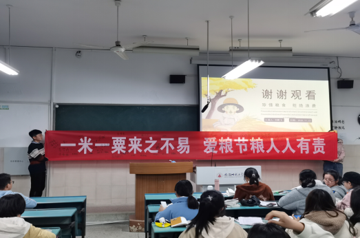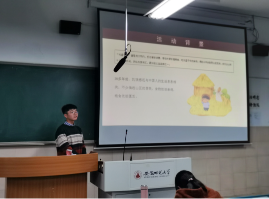 活动伊始,何鹏飞将目光聚焦到“光盘行动”上,简明扼要的介绍了“光盘行动”的活动背景、开展历程和社会评价,并以此为起点,深入展开了对勤俭节约的介绍,更加深了同学们对勤俭节约的理解。何鹏飞还精选了一个个生动的故事,列举了一系列的精准数据,更加生动形象地展现了勤俭节约的良好社会风尚。