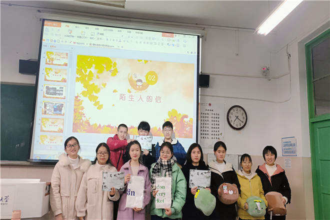 刘颖在会上对班级在11月举行的“暖秋”活动做了总结,她肯定了同学们高涨的参与热情,对同学们的作品给予赞赏。与此同时,在总结报告中,刘颖公布了一等奖、二等奖和三等奖名单,给全班同学均发放了礼品,邀请获奖同学合影留念,展示了部分获奖同学作品,赢得了同学们的阵阵掌声。宣读获奖名单之后,刘颖请全体同学共同完成一个小游戏,将自己最想说的话写在一张明信片上,然后由班委打乱重新发放。同学们纷纷将自己的祝福、期待写在明信片上,心里默默盼望着收到明信片的同学可以感受到温暖。更有同学主动分享自己收到的明信片祝福语,一股脉脉温情在同学们之间传递开来,最终会议在热烈的掌声中结束。