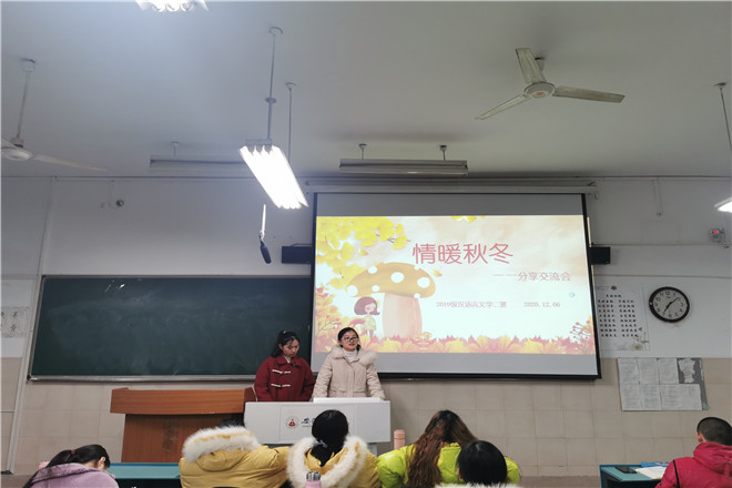 时光匆匆,已是深冬,天气转冷,往日温暖的秋阳已经一去不复返。为帮助同学们回味曾经的无限风光,同时对之前举办的“暖秋”活动进行总结,2020年12月6日晚7点,2019级汉语言文学2班在行知楼2050501教室举行“暖秋”活动总结班会。会议由2019级汉语言文学2班生活委员刘颖主持, 2班全体同学按时到场参与。