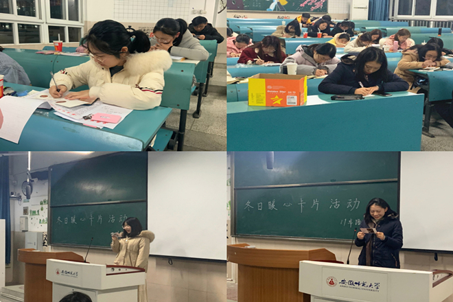 二十四节气中小雪刚过,大雪未至,气温逐渐下降,冬天的脚步也渐渐靠近。温度降低,感情升温,冬日里的一张张卡片,传递的不仅是文字,更是温暖的情谊。为促进大家情感的交流,向最想传达“温暖”的人手写一张卡片,12月7日晚于行知楼5号楼201教室,2019级汉语言文学卓越语文教师实验班举行冬日暖心卡片分享活动,活动由文艺委员陈欢主持。