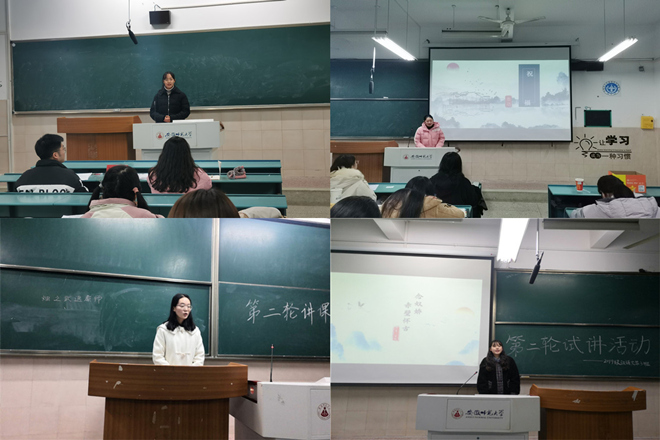 循序渐进,在摸索中成长。有了第一次讲课的经验后,同学们的讲课更加熟练自然——汉语言文学2班的孙安同学用积极热情的语调,展示了《劝学》这一课。君子曰:“学不可以已”,他通过对文章的讲解,重点突出了学习的重要性,其他同学也都在本次说课活动中展现出了自己最好的状态;汉语言文学3班的大部分同学结合PPT进行试讲,试讲篇目包括《雷雨》、《登高》、《念奴娇赤壁怀古》等。吸取了第一轮试讲的经验教训,大家更加重视这次的试讲机会,评委和计时员也都恪尽职守,帮助彼此在不断摸索中成长。