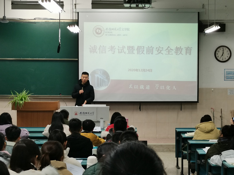 为进一步加强考风考纪和安全教育,2020年12月24日,2020级中国语言文学4班、5班,秘书学(专升本)班分别在2010501、2050103、2050202教室召开了诚信考试暨假前安全教育主题班会。班会由辅导员周青松老师主持,3个班级共计271名同学全员参会。