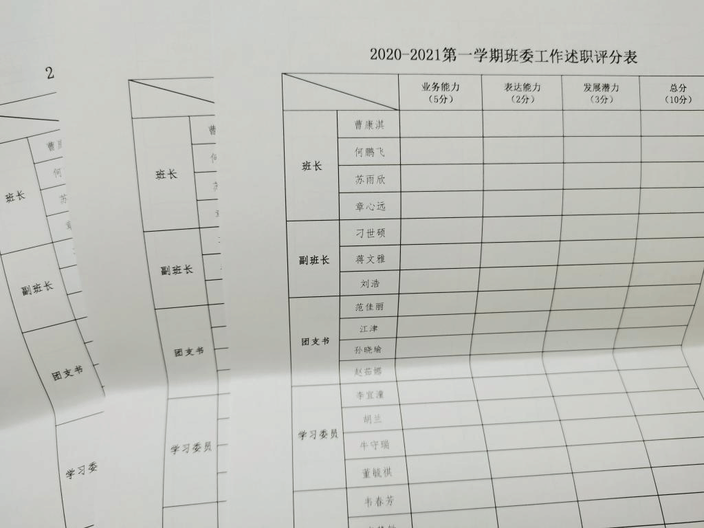 新学期,新起点。会议伊始,杨老师给每位班委分发工作述职评分表,通过互评和自评,客观呈现工作成效。随后大家一一上台,对上学期的工作完成情况进行了总结、对存在的问题进行了反思,同时也对新学期的工作进行了规划与展望。