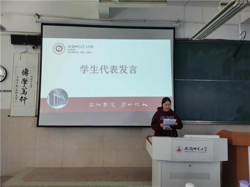 会议伊始,万振锐上台发言,并宣布会议开始,钱佳佳同学作为学生代表上台发言:她在发言中引用了习近平主席的“青春由磨砺而出彩,人生因奋斗而升华”,以此呼吁同学们要充分发挥青年风采,积极进取,争做“三好学生”。她引经据典,点明了“三好学生”的三点内涵——树立“明镜所以照形,古事所以知今”的历史观,争当勤学理论的“上进生”;学习“长风破浪会有时,直挂云帆济沧海”的实践观,争当攻坚克难的“特长生”;领悟“江山就是人民,人民就是江山”的人民观,争当实干兴邦的“优等生”。她的发言语句典雅,言辞深切地表明了身为新时代新青年,同学们应当肩负起自身的责任和义务,希望大家可以在不断的学习和思辨中超越自我。发言中,钱佳佳作为学生代表肯定了2019级卓越语文教师实验班团支部2020年度的工作成果,防控抗击疫情、志愿服务活动和义务劳动等方面都取得优异成绩。