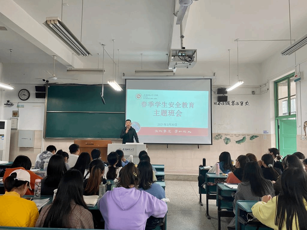 330日,20级中国语言文学4班、5班与秘书学(专升本)班分别召开春季学生安全教育主题班会。班会由辅导员周青松老师主持,全班同学参加。